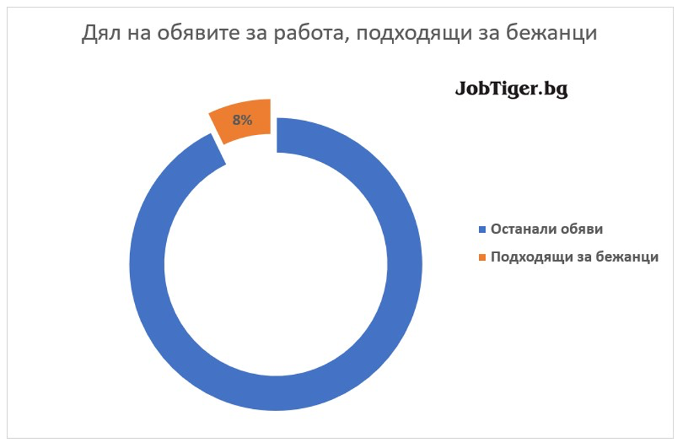 Броят на обявите за работа, подходящи за бежанци, през юни е малко над 2500 (8% дял от всички обяви). Както и при останалите показатели, броят на тези обяви също е намалял и те са със 7% по-малко спрямо предходния месец.