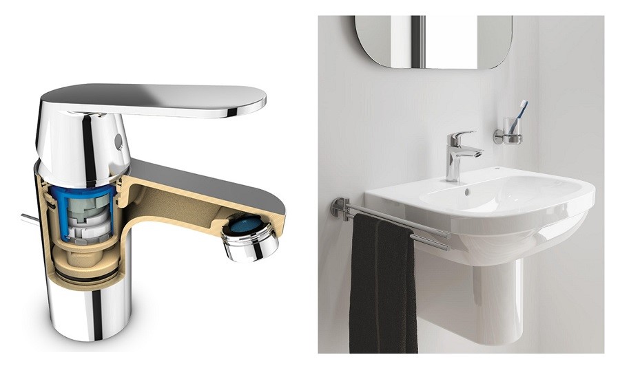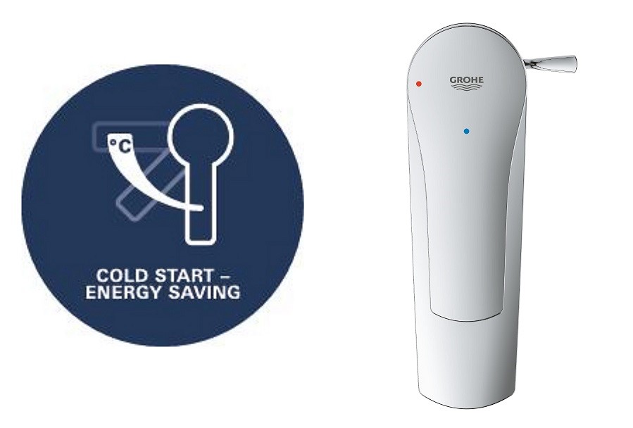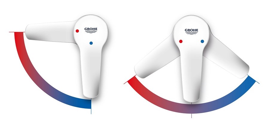 При енергоспестяващите (ES) смесители на GROHE, ръкохватката се задейства от средно положение, където се пуска студена вода. Движението на ръкохватката се извършва само наляво от средното си положение – така че потребителят няма да използва ненужно топла вода.
