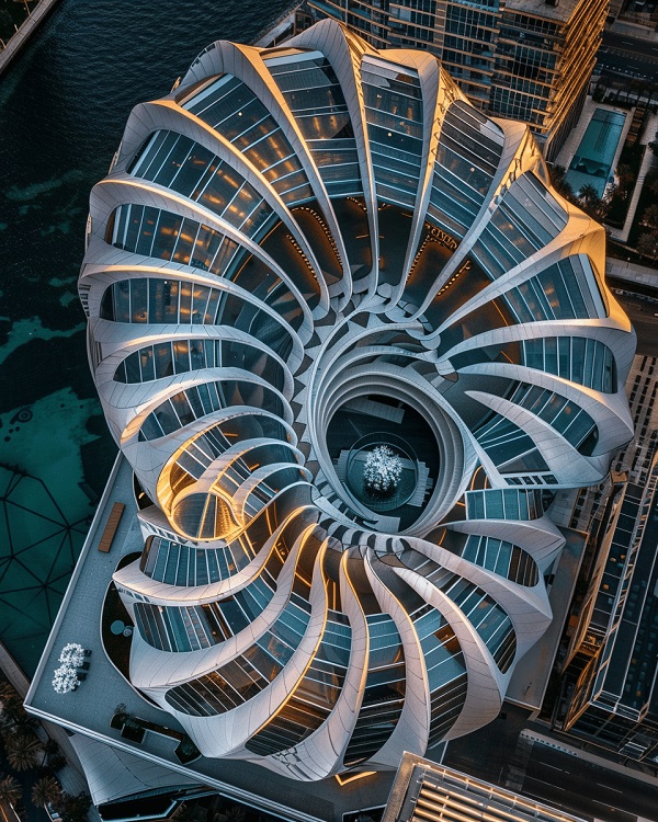 Тясно свързана с редицата на Фибоначи и златното сечение, тази визуално приятна обвивка осигурява отправната точка за идеята на архитекта. Разработени с помощта на Midjourney, ChatGPT и LookX, дизайните на Бхатия още веднъж доказват естетическата сила на това математическо съотношение.