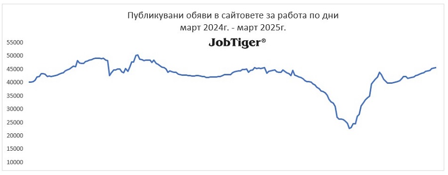 През м. март отчитаме ръст на предложенията за работа в страната. Броят на обявите за работа е нараснал с 8% спрямо предходния месец, като те са около 45 500 в края на м. март – това показва месечният анализ на HR компанията и кариерен сайт JobTiger.