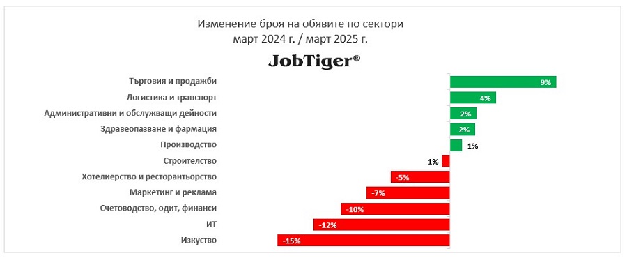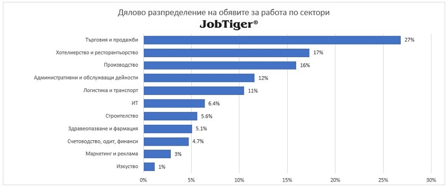Разпределението на обявите през март е, както следва: Секторът „Търговия и продажби“ вече заема над 1/4 от общото предлагане в страната с цели 27%. След него се нареждат секторите „Хотелиерство и ресторантьорство“ (17%), и „Производство“ (16%). Следват „Административни и обслужващи дейности“ (12%), „Логистика и транспорт“ (11%), „ИТ“ (6,4%), „Строителство“ (5,6%), „Здравеопазване и фармация“ (5,1%), „Счетоводство, одит, финанси“ (4,7%), „Маркетинг и реклама“ (3%) и „Изкуство“ (1%).