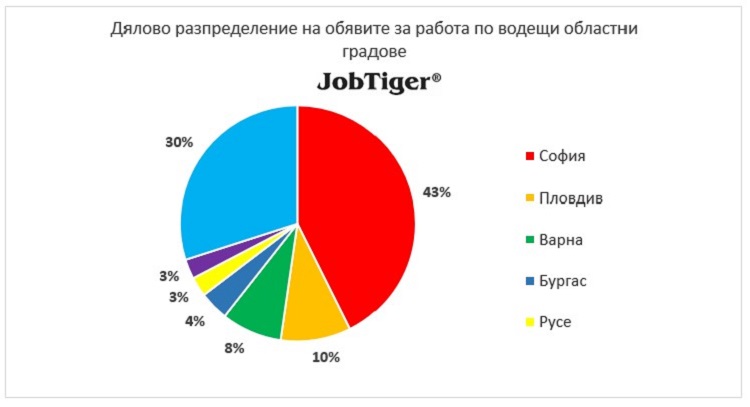 Във водещите областни градове наблюдаваме ръст на обявите за работа, както следва: София (2%), Пловдив (6%), Варна (24%), Бургас (17%), Русе (7%) и Стара Загора (6%).