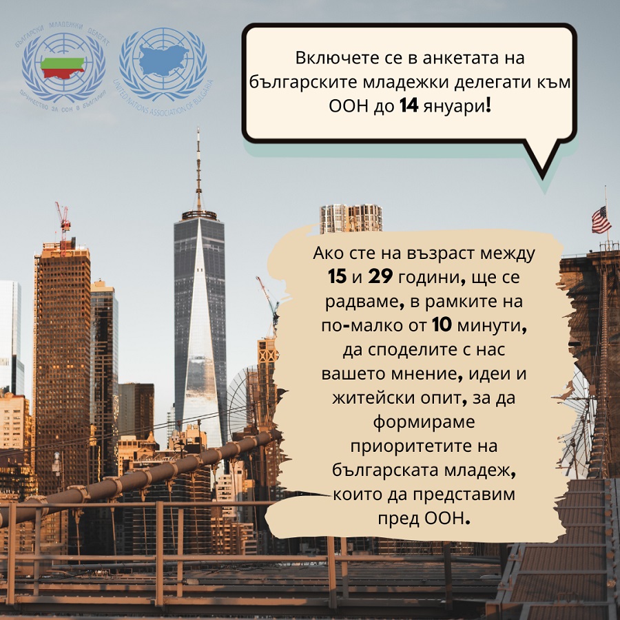 На 26 ноември стартира националната анкета на българските младежки делегати към ООН за 2024-2025 г. – Емили Караколева и Светослава Симеонова. Ежегодната инициатива е насочена към младежи между 15 и 29 години и подкрепя основната мисия на младежките делегати да бъдат мост между младите хора в България и институциите, както на национално, така и на международно ниво.