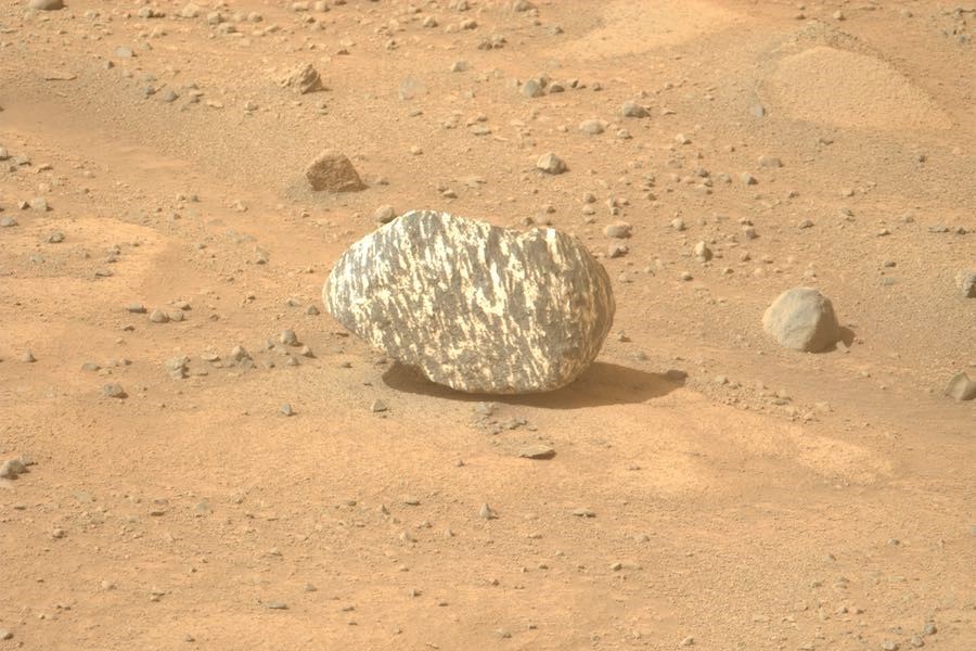 През юни, докато прекосява планината Уошбърн, „Perseverance“ открива искрящо бяла скала от фелдшпат и пироксен, която не се различава много от този камък, чиято големина е приблизително наполовина по-малка.