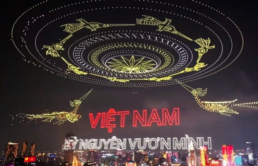 В зрелищно синхронизирано шоу, стотици дронове осветиха небето с ярки цветове, пресъздавайки историята на Виетнам в спиращи дъха формации. Те създават национални емблеми, исторически сцени и градски силуети, превръщайки се в най-значимото представление с дронове, осъществявано някога.