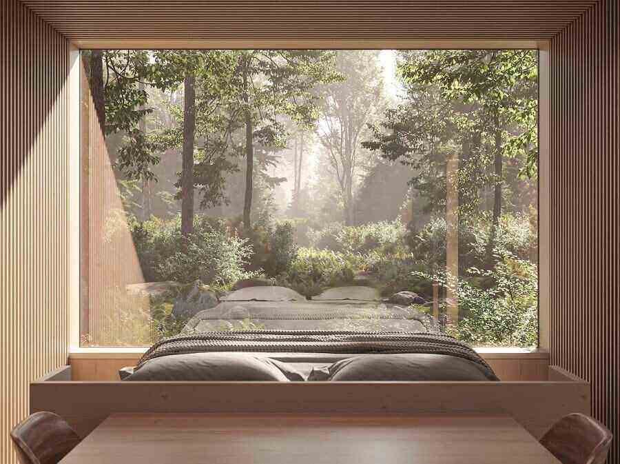 Всяка каюта е с площ от 275 квадратни метра и включва съвременна спалня с естествени тонове и светлина, баня с дъждовен душ, частна палуба и кухня с топли, естествени покрития. Изчистената, съвременна естетика е следвана в целия интериор, което позволява на посетителите да изчистят мислите си и да се съсредоточат върху гората около тях.