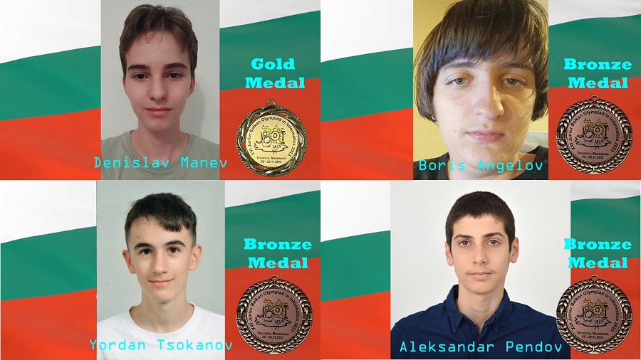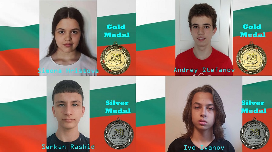 В него златни медали взеха Симона Христова от 10. клас на Природоматематическата гимназия „Нанчо Попович“ в Шумен и Андрей Стефанов от 9. клас на Първа частна математическа гимназия- София. Сребърни медали спечелиха и деветокласниците Серкан Рашид и Иво Иванов ППМГ „Нанчо Попович“.