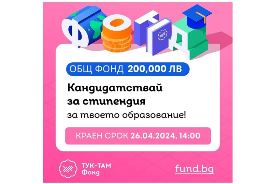 Тук-Там обявява старта на кампанията за своя Фонд за стипендии за 2024 г. с обща стойност от 200 000 лева. Това е най-мащабната стипендиантска програма от създаването ѝ през 2016 г. Кандидатстването е отворено до 26 април, 14 часа на fund.bg.