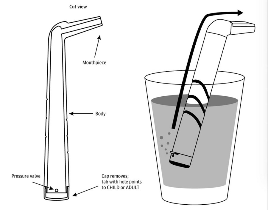 L-образната сламка за пиене спира 92% от атаките на място, изисквайки всмукване и преглъщане и се предлага като патентован продукт за около петнадесет долара.