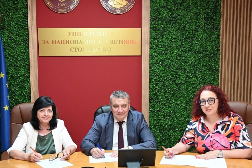 На церемонията по подписването присъстваха и проф. д-р Цветана Стоянова – заместник-ректор по институционално и бизнес сътрудничество и студентски политики, и Десислава Паунска – ръководител на отдел „Връзки с обществеността и маркетинг“ в УНСС.