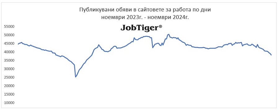 През ноември обявите за работа са намалели с 8% спрямо предходния месец октомври. С около 3000 по-малко са предложенията за работа в страната, като техният общ брой в края на месеца е малко над 38 000 – това показва месечният анализ на HR компанията и кариерен сайт JobTiger.