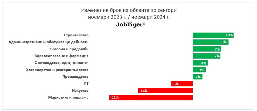 По-малък брой на обяви за работа наблюдаваме и в секторите „Строителство“ (310 предложения по-малко, 12% спад), „Административни и обслужващи дейности“ (300 предложения по-малко, 6% спад), „Маркетинг и реклама“ (200 предложения по-малко, 16% спад), „Здравеопазване и фармация“ (130 предложения по-малко, 6% спад) и „Счетоводство, одит, финанси“ (120 предложения по-малко, 6% спад).