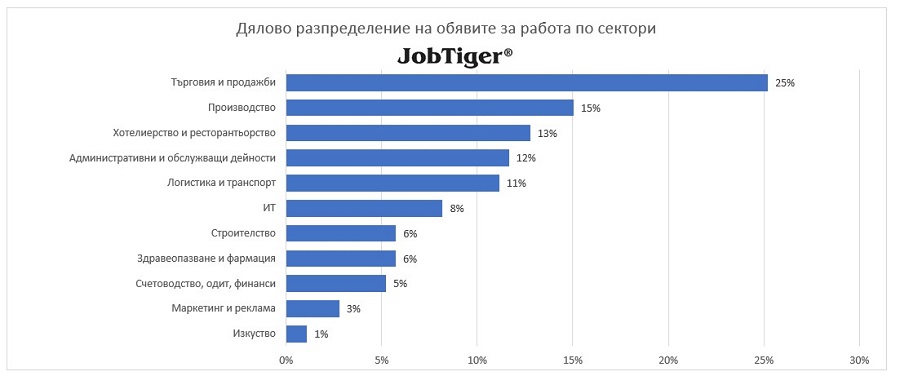 Въпреки наблюдавания спад челната тройка по дял на предложенията остава същата: „Търговия и продажби“ (25%), „Производство“ (15%) и „Хотелиерство и ресторантьорство“ (13%).