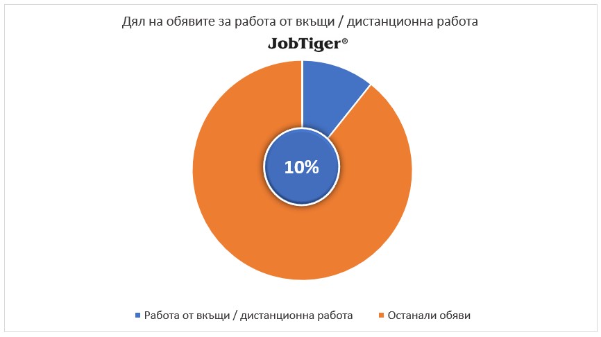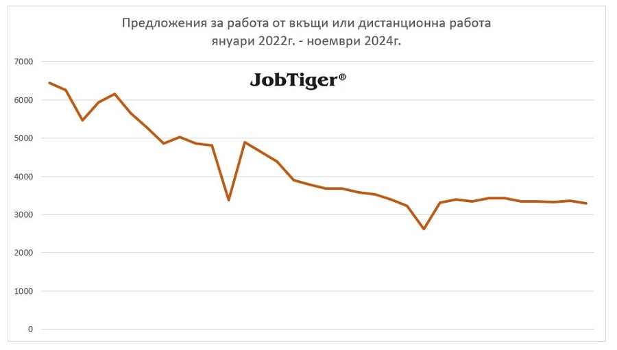 Според наблюденията на HR компанията и кариерен сайт JobTiger на последните 2 години броят на предложенията за работа от вкъщи или дистанционна работа е намалял наполовина. В началото на 2022 г. отчетохме близо 6500 предложения от този тип, а в края на ноември техният брой е намалял с цели 49%.