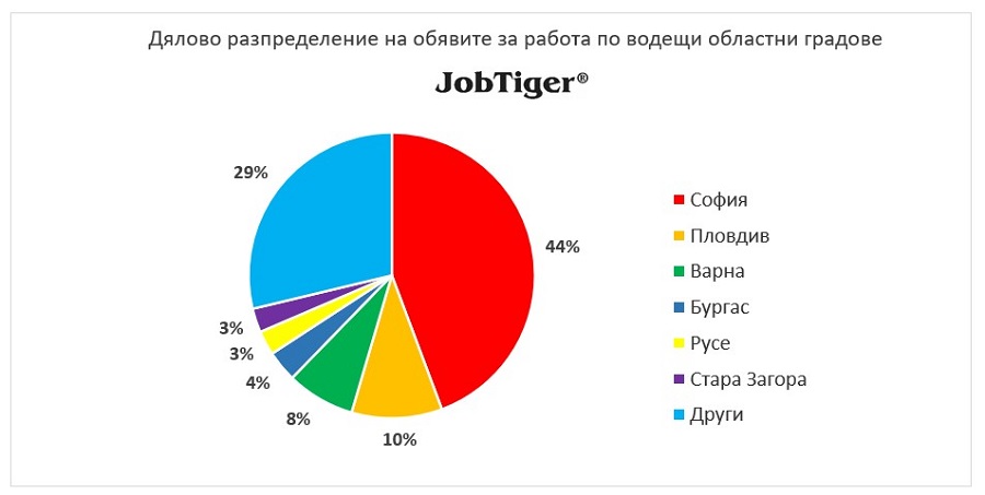 Като дялово разпределение обявите в София са 44%, а в останалите градове: Пловдив (10%), Варна (8%), Бургас (4%), Русе (3%) и Стара Загора (3%).