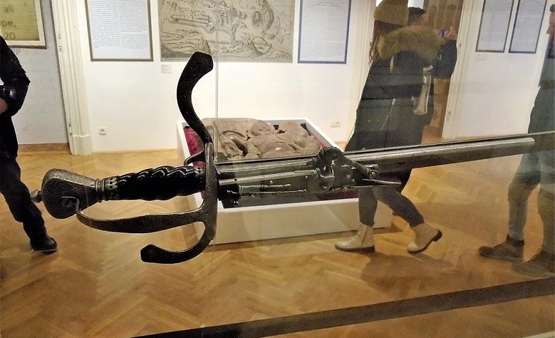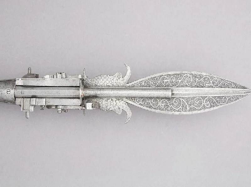 Изобразеното по-горе оръжие е немско копие от XVI в. е богато украсено и включва две цеви за мускети с колелца калибър 41 мм, сляти с двете плоски страни на главата на копието.