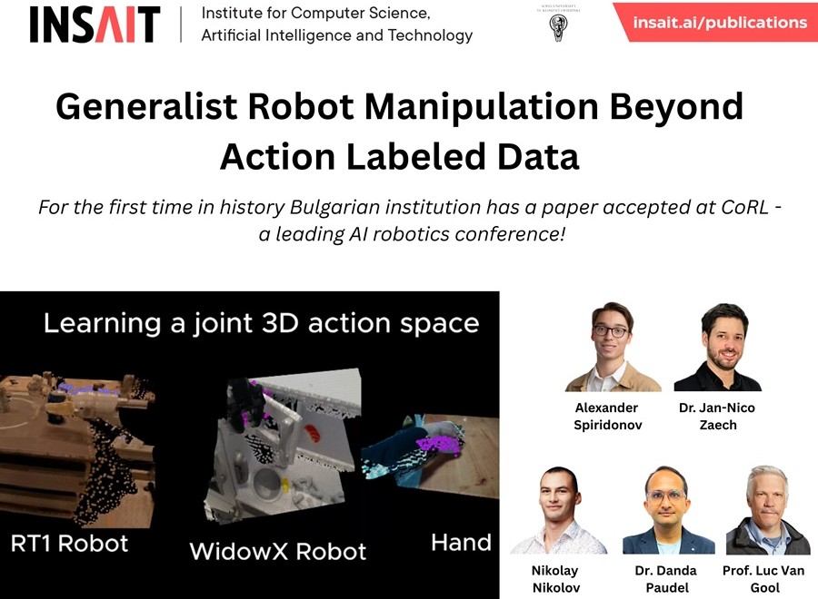 INSAIT announces a landmark achievement: for the first time in history, a Bulgarian institution has a paper accepted at the Conference on Robot Learning (CoRL), a top research conference in robotics. The paper, titled “Generalist Robot Manipulation Beyond Action Labeled Data”, will be presented at CoRL 2025, taking place September 27–30 in Seoul, South Korea.