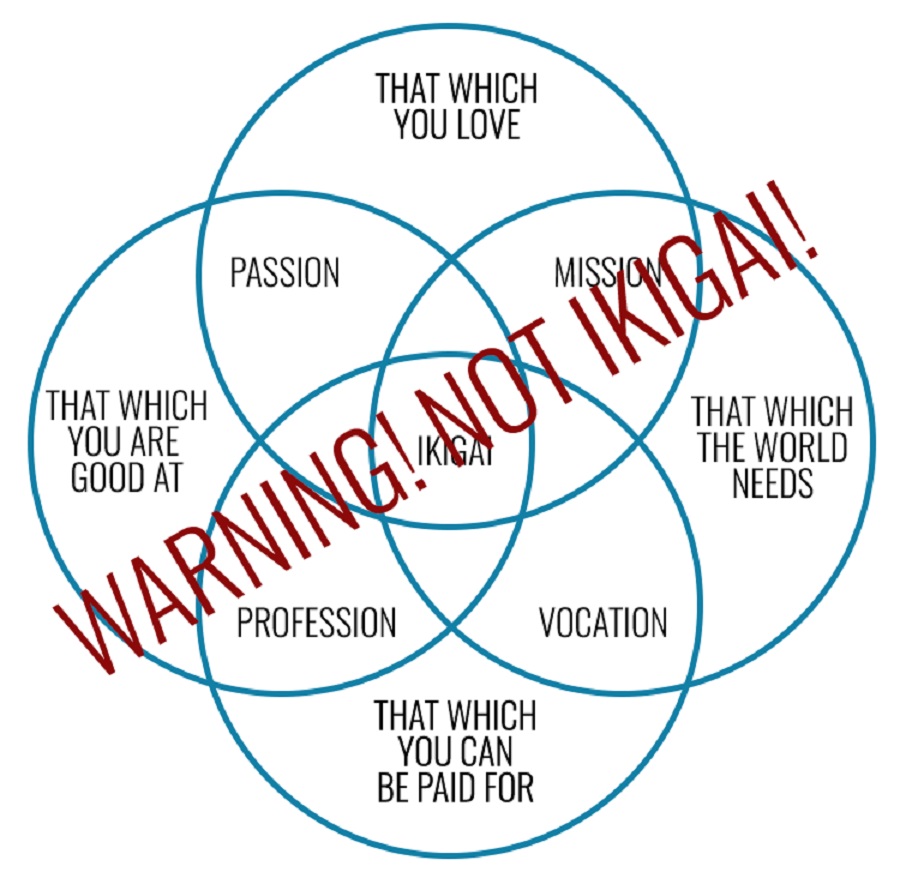Често наричана Икигай диаграма или Икигай символ, диаграмата на Вен по-долу не е Икигай концепцията. Рамката не представя точно концепцията за Икигай. Японците не следват тази рамка, нито обмислят четирите въпроса, когато мислят за своя Икигай.