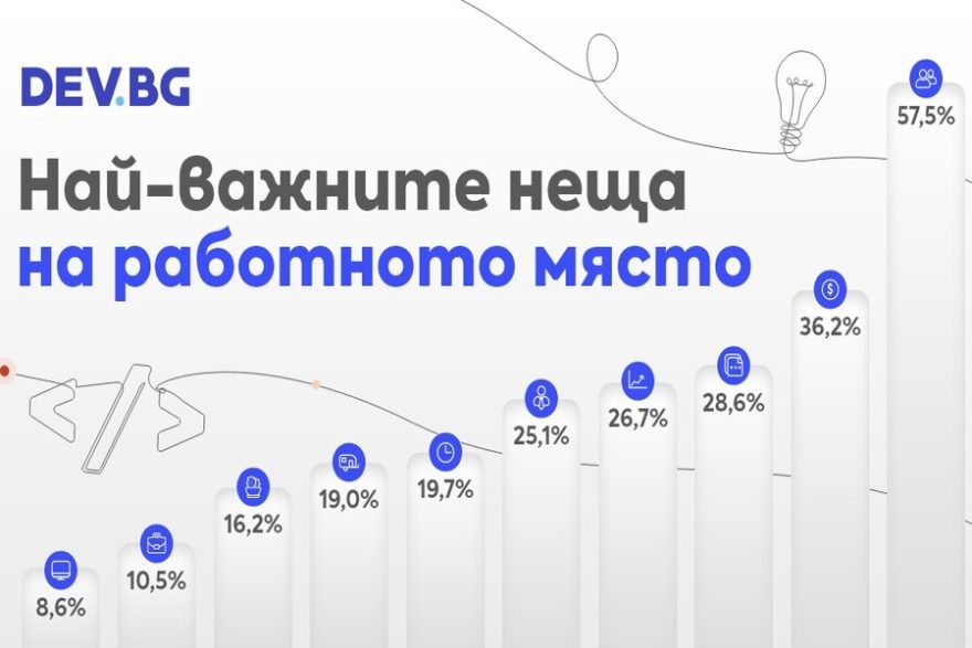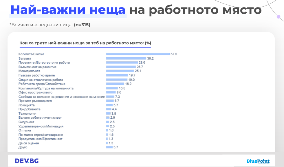Запитани кои са трите най-важни неща за тях на работното място, близо 60% от респондентите поставят начело колегите и екипа. С това категорично оставят заплатата на второ място по значимост. В топ 3 влизат проектите и типа работа, а малко след това се нареждат възможностите за развитие в компанията – нещо важно за IT хората и според предишни проучвания на DEV.BG. Веднага след това по значимост респондентите поставят мениджмънта на компанията.