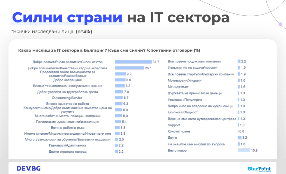 Според проучването на DEV.BG, IT хората смятат секторът за много добре развит. Това се подкрепя и от традиционното допитване Баском Барометър 2022, според което през 2020г. IT индустрията нараства с близо 600 млн. лева и това я превръща в най-бързо растящия сектор – с по около 20% годишно от 2015г. насам.