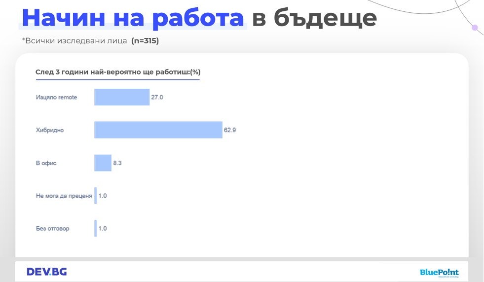 62.9% от IT хората очакват след три години да работят хибридно. Близо ⅓ (27%) от респондентите пък споделят, че ще работят изцяло отдалечено. Тези, които предпочитат да работят от офиса са само 8.3%.