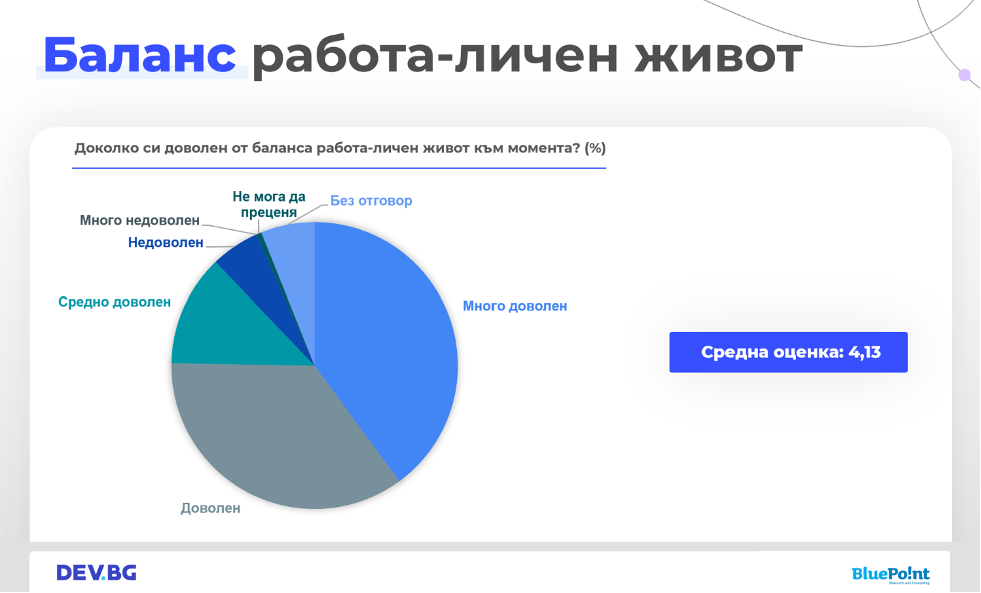 Запитани как оценяват баланса работа – личен живот, респондентите в проучването декларират доста висока стойност – 4.13 от максимална 5. Това е чудесна новина, както за традиционно доста натоварените IT специалисти, така и за компаниите и хората, които се грижат за добруването на служителите си.
