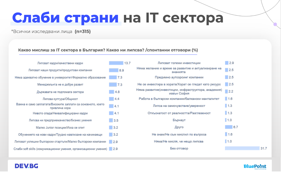 В проучването специалистите споделят вижданията си къде секторът не се справя толкова добре. На първо място те поставят липсата на достатъчно качествени кадри. Това не е изненада, предвид, че броят на публикуваните обяви на специализирания сайт на DEV.BG обикновено надхвърля 6000.