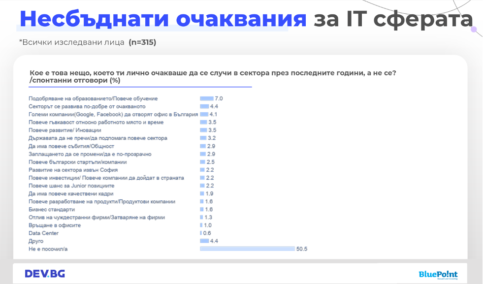 В проучването на DEV.BG над 50% от респондентите не посочват категорично нещо, което да са очаквали, а да не се е случило по отношение на развитието на сектора през последните години. Това потвърждава положителната оценка на работещите в индустрията.