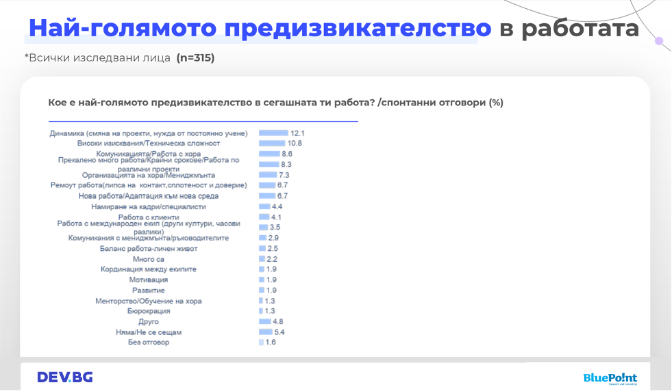 Като най-голямо предизвикателство участниците посочват динамиката на работата и честата смяна на проектите. Данните са на база спонтанни отговори и се отчита като казус за определена част от IT хората. На второ място са високите технически изисквания и сложност на проектите, а в топ 3 основни предизвикателства попада и темата за комуникацията между хората и екипите.