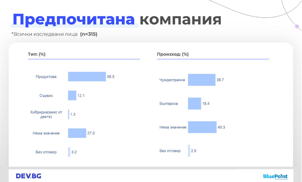 Над половината от респондентите (56.5%) посочват, че искат да работят в продуктова компания. Това, което прави впечатление обаче е, че за близо 30% от IT специалистите няма значение видът компания и биха работили и в продуктова и в аутсорсинг организация. Относно произхода на фирмите – струва си да се отбележи, че над 40% не посочват предпочитание, а 18.4% от респондентите заявяват, че искат да работят за българска фирма.