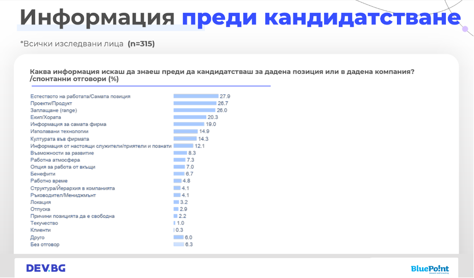 Запитани какво искат да знаят, преди да кандидатстват в дадена компания, IT хората споделят, че най-важно е да имат информация за естеството на работата. Веднага след това се нареждат проектите и продуктите, по които ще работят. В топ 3 попада и заплатата, която макар и да отстъпва първо място по важност, все още е значителен фактор при избор на ново работно място. А социалните придобивки – нещо, което компаниите традиционно поставят на фокус – за IT хората остават назад в класацията.