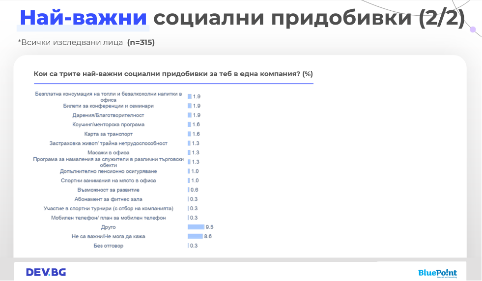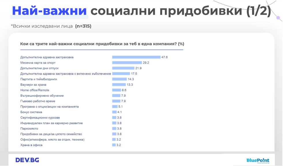 Придобивки в IT компаниите има и това може лесно да бъде проследено на сайта на DEV.BG в раздел Компании, където за всяка организация има публикувана подробна информация, в това число и за всички бенефити, които се предлагат за служителите. Доколко тези придобивки са оценени от самите IT специалисти обаче е спорно. Близо 50% от тях споделят, че най-важната им такава е допълнителното здравно осигуряване – нещо, което всички компании по принцип предлагат. Изненадва второто място при най-желаните социални придобивки, а именно – осигуряването на месечна карта за спорт. Според данните от проучването този по-скоро незначителен разход за компаниите може да има тежест за IT специалистите при избор на бъдещ работодател пред друг, който не предлага такава придобивка. На третото място сред най-желаните бенефити се нареждат допълнителни дни отпуск към задължителните 20 годишно.