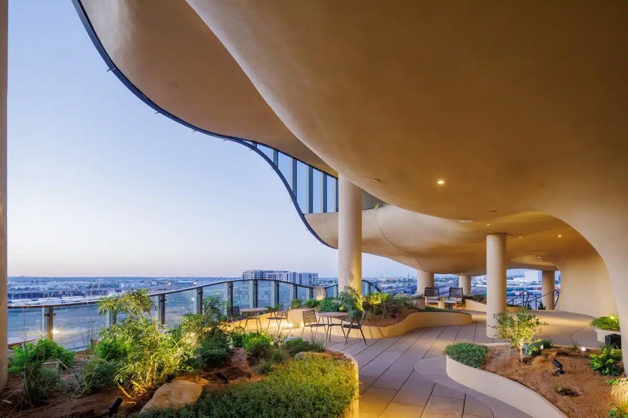 Местата за сядане на открито, споделените стаи, фитнес съоръженията и терасата на покрива с басейн, спа център и градина са проектирани така, че да насърчават общността.
