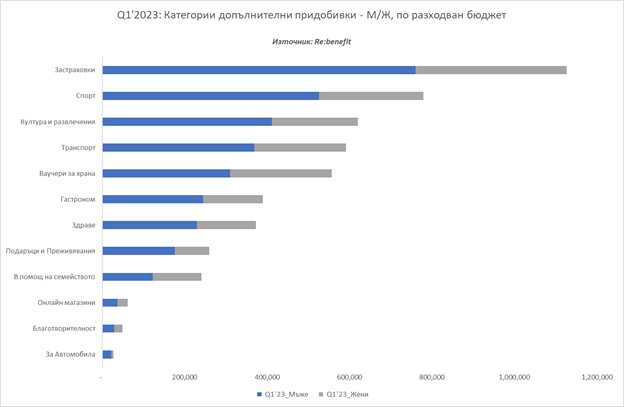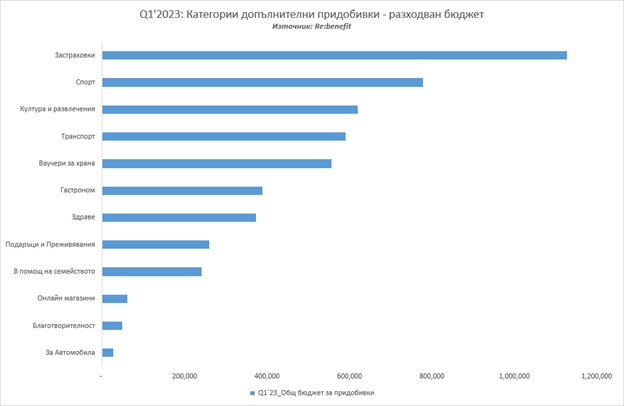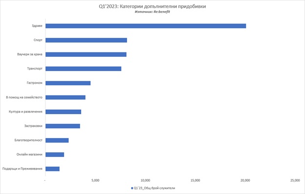 Фаворити са придобивките в категория “Здраве”, „Спорт“, „Ваучери за храна“ и „Транспорт“, от които са се възползвали най-висок брой работещи. Любопитно е, че предпочитанията към категория „Подаръци и Преживявания“ са намалели значително в сравнение с предходни периоди, като през първото тримесечие на 2023 г. се класират на последно място в списъка.