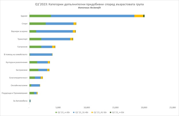 Категориите „Здраве“, „Спорт“, „Ваучери за храна“ и „Транспорт“ биват най-търсени сред работещите, според проучването на Re:benefit. Най-широко одобрение на спортните активности се наблюдава сред служителите между 31 и 40 години, за които възможностите в категория „Спорт“ са на второ място по значимост. „Ваучерите за храна“ представляват втора преференция за групата между 31 и 40-годишните, но имат силно влияние и за аудиторията между 41 и 50- годишните. Придобивките в категория „Транспорт“, като ваучери за гориво, карта за градски транспорт и ваучери за такси, са по-предпочитани от най-младите (под 30 г.), в сравнение с „Ваучерите за храна“. Все пак, и за останалите възрастови групи те са в топ 4 на най-предпочитаните придобивки. „В помощ на семейството“ е петата по избор категория в списъка на най-популярните придобивки сред служителите на възраст 31 – 40 г. В тази категория, служителите са избирали сред придобивки като почасов гледане на деца, професионално почистване на дома и др.
