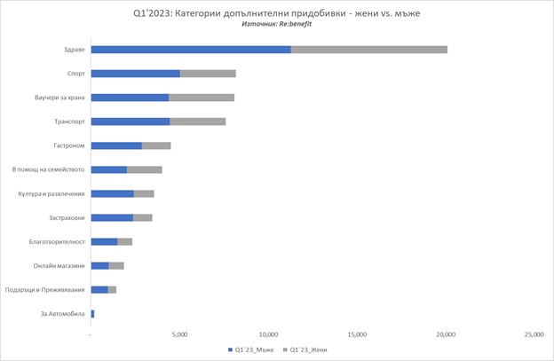 Освен на здравни придобивки, мъжете отдават приоритет и на спортните такива. Следващите, най-предпочитани са ваучерите за храна и транспортните услуги, които са със съпоставими стойности. Силно впечатление прави фактът, че предпочитанията на мъжете към категория „Гастроном“ надвишава тези при жените. Същата тенденция наблюдаваме и при придобивки, обвързани с благотворителност и дарения.