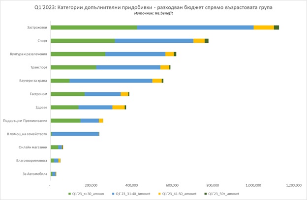 Тенденцията тук е, че най-голяма част от бюджета си работещите отделят за застрахователни услуги. Най-обширната група по възрастов признак – служителите между 31 и 40 години, разпределят своите финансови ресурси за допълнителни придобивки в категориите „Спорт“, „Ваучери за храна“, „Транспорт“, „Култура и развлечения“ и „В помощ на семейството“. От своя страна, най-младите, на възраст под 30 години, предпочитат спорта, забавленията и транспорта, когато планират наличния си бюджет за месечни придобивки.