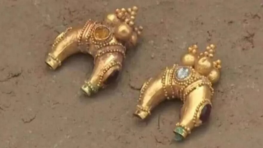 Обеците са с форма на полумесец и се предполага, че представляват Луната в полихромно злато с тюркоаз и рубини. В долната част са разположени гроздове, които освен че са прекрасна украса, отразяват слънчевата светлина в различни посоки.